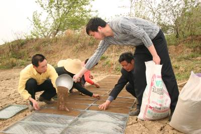 4月26日,县新闻中心主任何永斌(左)正与曹武镇九房村村民一道下地参加稻田早育秧劳动。京山县在“三万”驻村工作中,真心诚意为村民解决实际问题,与群众打成一片,同吃同住同劳动,并千方百计为村民解决水电路的瓶颈问题,受到村民的好评。 (张文胜 摄)