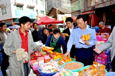 民以“实”为天 4月27日,恩施市红土乡组织工商、质监、卫生等有关部门负责人正在对部分食品等经营场所进行食品安全专项检查。 “五一”节前夕,该市卫生,工商、质监等部门联合起来把好安全关,对食品的加工、包装、销售等各个环节严格控制,特别是要从源头上控制,加大对各企业加强节日期间的安全巡查力度,确保广大市民过上一个安全、祥和的“五一”劳动节。(本报视界网彭绍峰摄)