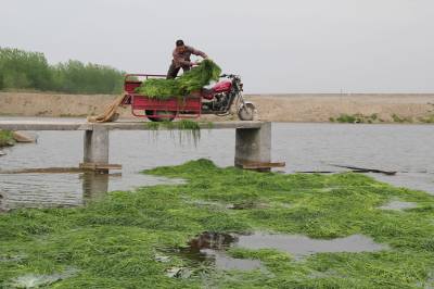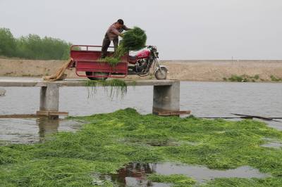“绿色鱼”游进大市场 4月27日,谷城县冷集镇甘家庄村农民张志强在往鱼塘投放牧草。2008年,张志强等以担保贷款的形式,在龙泉信用社贷款20万元,加上他们的积蓄,投资60多万元,兴建了一口60多亩的鱼塘。养鱼期间,张志强种植了牧草,“绿色鱼”游进大市场,年收入30多万元。像张志强一样的渔农在该镇有300多家。 本报视界网马明刚摄