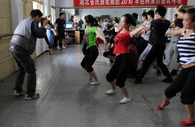 4月27日,湖北省民族歌舞团全体舞蹈演员正在排练民族舞蹈《峡江鼓韵》。