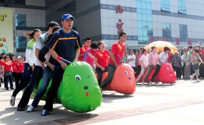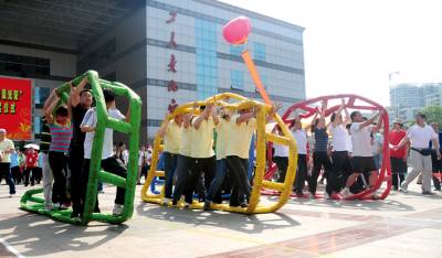 图(一)职工正在进行 毛虫竞技”比赛。 图(二)职工正在进行“车轮滚滚”比赛。