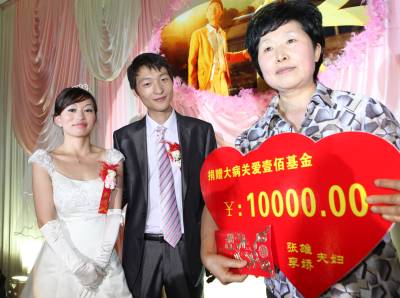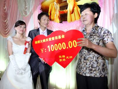 4月29日,在湖北省长阳土家族自治县城区上演了一场别样的“爱心婚礼”。在湖南长沙小伙张雄、湖北 长阳女孩李娇当日的婚礼仪式上,夫妇俩宣布取消蜜月计划,拿出一万元现金捐给该县刚设立的大病关爱 壹佰基金,用于救助大病困难家庭。据悉,两人在深圳创业打拼时相识相爱,回到长阳筹办婚礼时,得知 该县正在募集大病关爱基金。