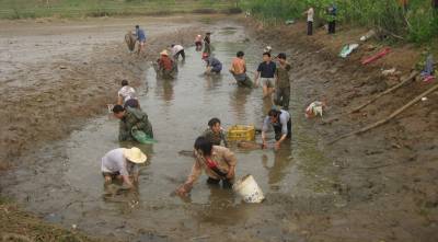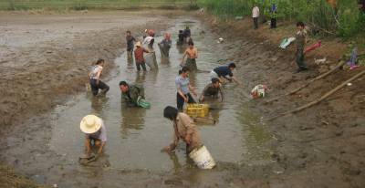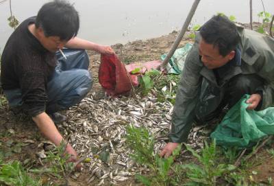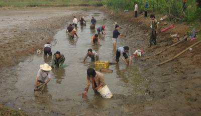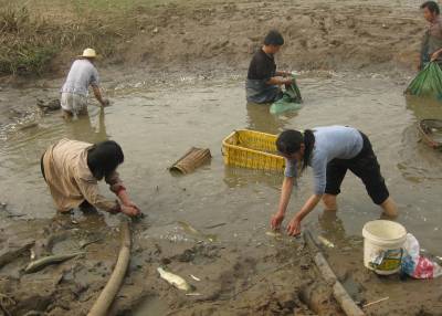 4月30日,安陆市王义贞镇太平村6组村民正在干涸的申家大堰捉鱼。据了解,去冬今春以来,由于降雨偏少,该市15个乡镇小一、二型水库及骨干塘堰、河坝存水仅为正常年份的50%,有三分之二的塘堰已经干涸,全市受旱面积达10万亩,旱情严重影响了该市农业春耕生产。 摄影:王代金