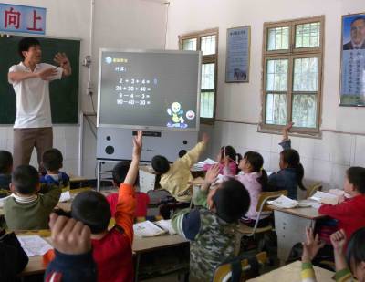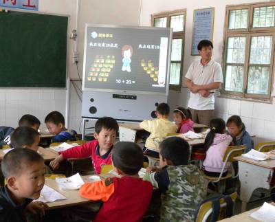青曲镇中心小学是湖北郧县偏僻的学校之一,窗外是裸露的荒山,窗内却是一流的信息化教学设备。2008年初,10间教室都有LG背投式电子白板,2009年,建起了远程教学监控系统,每个老师的课堂都公开了,随时可能有领导和同事在办公室甚至远程观摩他上课,教师通过网络与全国名师进行教学研究,学生通过网络与北京上海的小学生互动。学校的信息技术设备条件走到了郧县和十堰市前列。 董甲伟摄