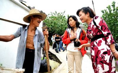 5月1日,来自武汉市的两名游客向郧县茶店镇樱桃沟村老农了解樱桃树的栽植与管理情况。当日,郧县第四届樱桃草莓节在此举行,吸引了十堰等周边地区万余游客。近年来, 该村利用地理优势,大力发展以樱桃为主的小杂果经济,并从山形地势出发,依山顺水,不开山、不填沟、不毁树,形成了自然和谐的良性生态格局,成了鄂西北休闲旅游的好去处,年接待游客10万多人次,被评为省生态旅游名村,市新农村建设示范村。本报视界网 吴成林 摄