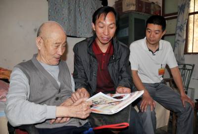 镜头二:上午6点半,杨文华来到菜园村四组建国前老党员、退伍伤残军人瘫痪在床的张祖国家里,把《健身指南》、《幸福生活》、《当代老年》、《大江南北》等8本书和200元现金交给了他,并祝他健康长寿。