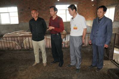 镜头四:上午7:15,杨文华来到后店子村一组刘国生、杨军宝的养猪场,了解他们的养殖情况,当他得知这两家年出栏牲猪千头以上,现在面临饲料价格上涨,资金周转困难,杨文华想办法通过媒体尽快找有关部门协调解决。