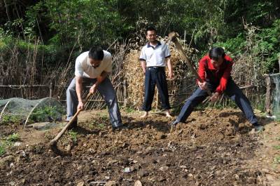 镜头七:8:38分,路过地边时,看到堰河村8组32岁的肖邦虎用一只手吃力的挖地时,杨文华和队员赵丰舟立即接过锄头,帮肖邦虎干起来,不一会功夫,一分地已挖好。