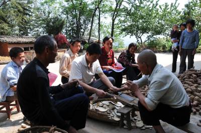 镜头十:上午10:15分,杨文华来到堰河村8组周殿义家,看到他家道场堆放很多未吃完的新鲜红薯,正在用刀擦成红薯干,他们边宣传惠农政策,边了解民情,边帮他们擦红薯干,帮他们采摘樱桃。
