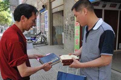 镜头五:上午7:30,杨文华自己购买的《来自高层声音》、《党旗飘飘》、《党组织建设百科大全》、《农村实用技术》等送给了后店子村村委会主任杨庆武手中。