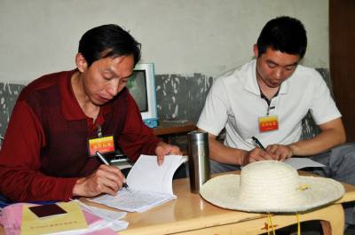 镜头十七:晚上11点,杨文华和队员赵凤舟一起碰头汇总当天民情走访调查情况,