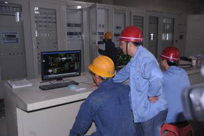 5月2日,在湖北世纪新峰余热发电中央控制室内,安装人员正在调试配电控制系统。由世纪新峰水泥公司与大连易世达新能源公司投入1.1亿元的13.5兆瓦纯余热电站,将有效利用水泥生产过程中的余热,建设9兆瓦和4.5兆瓦电站各一座。项目投产后可实现年发电量8000万度,年节约标准煤3万吨,减排二氧化碳8万吨,每吨降低水泥熟料成本15元左右。目前,项目基础工程已完工,发电机组在安装,机组有望在5月底并网发电。