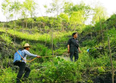 5月3日,竹山县潘口乡鱼岭村农民在技术人员的指导下,对新造林进行化学除草。竹山县为提高造林成活率,今年组织专业技术人员对新造林地进行化学除草试验,本着不影响新植苗木生长为原则,使用农达、飞达等除草剂进行除草。此次采用化学除草技术不仅费用低,效率高,省劳力,还能根除人工锄草所不能根除的多年生宿根性杂草,又没损伤新栽的幼苗,还能使病虫害大大减少,极大地促进了幼林的快速生长。(操春林)