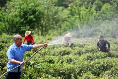 5月4日,竹山县城关镇刘家山村茶农李可一在给茶园浇水。去年入冬以来,竹山县持续干旱达6个多月,农作物受灾面积达63.6万亩,成灾达24.8万亩,绝收达5.2万亩;茶叶受灾面积达8万亩,预计春茶减产70%以上。干旱还导致17个乡镇人畜饮水极度困难。为把旱灾损失降到最低程度,竹山县抽调120多名专业技术人员组成4个专家组,深入田间地头指导抗旱救灾工作。目前,已清淤疏浚渠道2600多米,新开水渠250余条22000米,铺设抗旱引水管道26000米,投入抗旱劳力约9万个、抗旱机具420余台套,县直单位和帮扶工作队投入抗旱资金90余万元。(本报视界网 章磊摄)