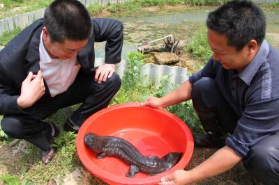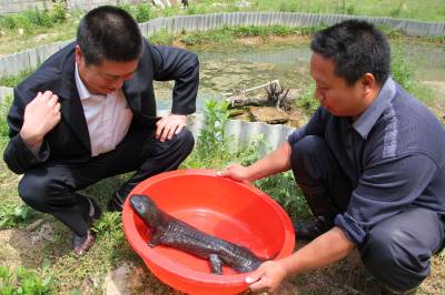 养殖大鲵发家 5月4日,庙滩信用社主任占应庆(左)在大鲵养殖户黄荣洲门前了解大鲵(娃娃鱼)生产、贷款使用情况。谷城县庙滩镇财神庙村农民黄荣洲,发挥当地水质优良、环境优美等诸多优势,在信用社的贷款支持下,养殖价格昂贵的大鲵140只,价值30多万元。 本报视界网马明刚摄
