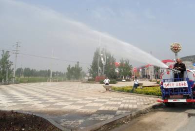 5月5日一辆“抗旱送水”车正在为郧县刘洞镇集镇清洗除尘。据了解,这辆车是该镇党委政府5月3日为缺水农户送水而租用的。因久旱无雨,该镇李家村部分农户水窖存水已近用完,面对青壮劳力外出务工留守的大都是妇女老幼这一现状,政府租车免费为该村送水。(高超 摄)