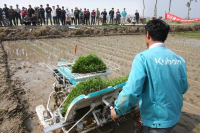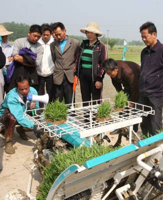 农机具在农村受青睐(随县) 5月5日,随州市一农机技术员在随县均川镇光河村指导农民,使用新型手扶插秧机插秧省时、省工、省劳带来的实际效益。据悉,该县今年农民购置新型插秧机250多台套,农机具在农村市场越来越受农民欢迎。本报视界网杨文明摄
