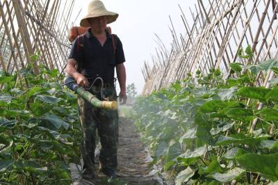 抓菜篮子鼓钱袋子 5月6日,城关镇邱家楼村农民在预防刚挂果的黄瓜病虫害。谷城县农信社针对近年来谷城城区人口逞不断上升势头的形势,发放贷款鼓励城郊农民和冷集、赵湾等乡镇的农民,种植高、精、尖蔬菜和高山反季节蔬菜,在丰富居民菜篮子的同时,鼓起自己的钱袋子,目前该县农民已种植蔬菜10多万亩。 本报视界网马明刚摄