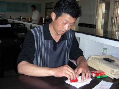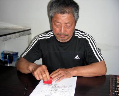 5月6日,在黄梅县黄梅镇竹林咀社区,村民理财小组成员饶细明在村民主理财小组审核通过后的村财务收支明细表上盖上“三瓣章”(如图)。