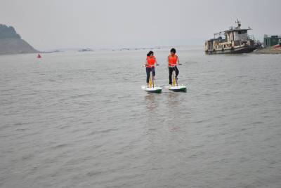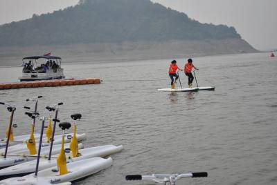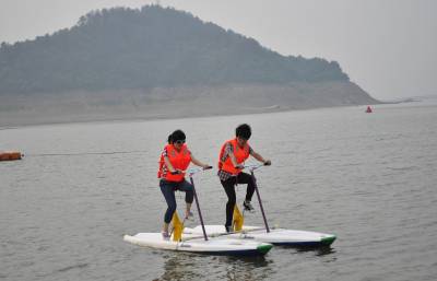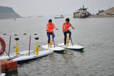 5月7日,一对游人正在太极湖上兴致勃勃地骑水上自行车,体验自由逍遥的过海神仙意趣。本月上旬,投资近3亿元的武当山太极湖港口进入试运行,同时开通丹江、郧县两条水上旅游航线。大岳号、玄岳号、武当号等几十艘先进的环保游船,让游客感受太极湖独特的水上游乐体验。尊大岳、朝武当、敬水神、悟大道,从亲水开始……
