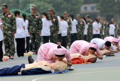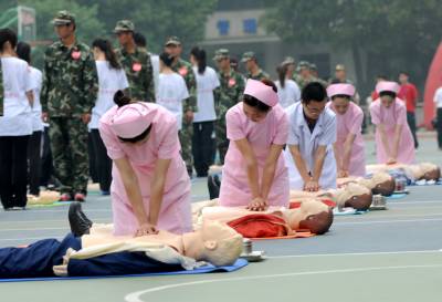 5月8日上午,在湖北医药学院校园里,驻十堰武警、消防官兵、公安特警和该校在校学生一千多人参加了心肺复苏急救等技能培训,以此来庆祝5•12国际护士节。