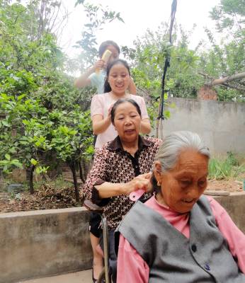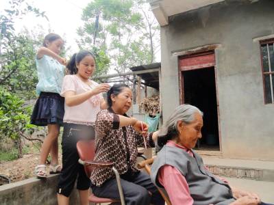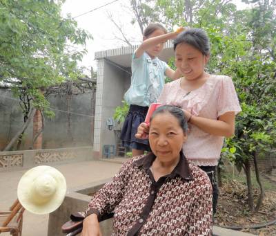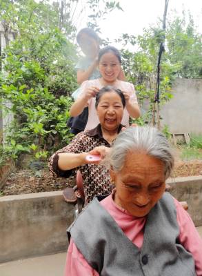 母亲节里的爱心作业 5月8日,郧县刘洞镇九年一贯制学校的一名小学生正在妈妈、外婆、老外婆的配合下完成学校布置的爱心作业。女儿给妈妈梳头、妈妈给外婆梳头、外婆给老外婆梳头,祖孙四代拼出了一张温馨的母爱阶梯图。(高超 摄)