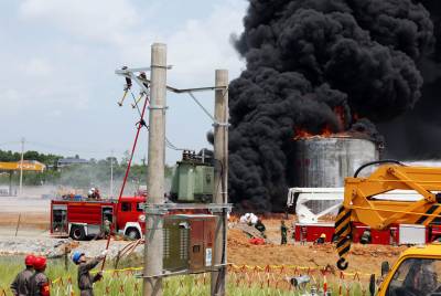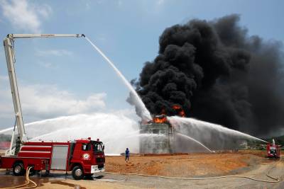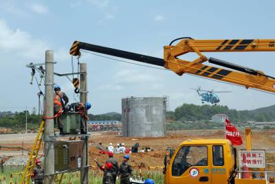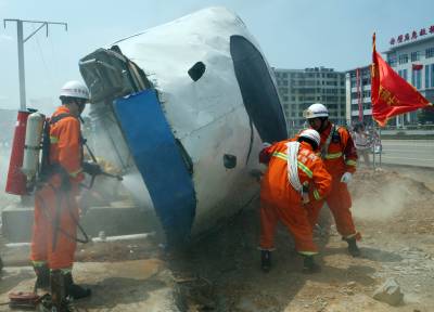 5月9日,在湖北省赤壁市进行的突发重大灾害事故应急救援综合实战演练中的油库爆炸消防灭火。为提高突发重大灾害事故应急救援综合实战的能力,5月9日上午,湖北省赤壁市模拟境内发生里氏5.1级地震,导致山体滑坡,致使正在境内行驶的列车出轨翻覆,附近的东方油库燃油泄漏爆炸起火,同时造成输配电设施、通讯设施等不同程度损坏。“灾情”发生后,武警消防、公安、电力、医疗、通讯、环境等10支专业应急救援队共290余名队员和27辆救援车紧急集结奔赴现场,迅速开展伤员抢救、油罐灭火、恢复供电和通讯等应急救援,同时,空降兵、直升机救援队等迅速向“灾区”增援。经过2个多小时的综合实战演练,圆满完成了预定的应急救援科目,展现了各应急救援队良好的专业素质和强大的协同作战能力。