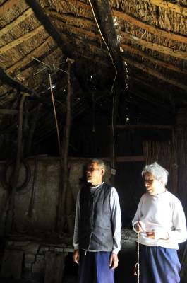 襄州区黄集镇薛集村8组,薛光平和老伴范小荣住在三间破败的小屋里。屋顶上铺的是麦秆,西面的外墙上有个大洞。家里除了床和柜子,再没有其他家具。家徒四壁下,堂屋土墙上的那面精致镜框便格外显眼。