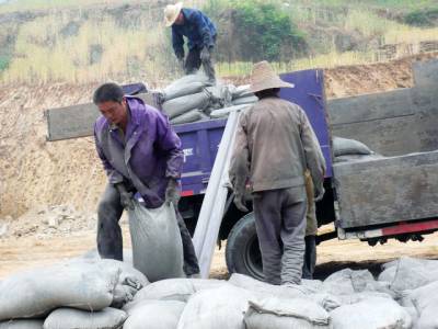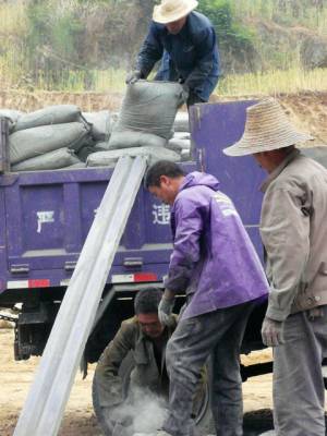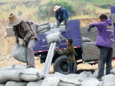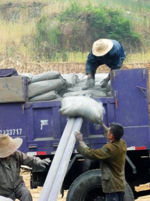 5月9日,一场中雨来临之前,几位挥汗如雨、灰头土脸的农民工在郧县五峰乡大石沟村内安移民安置点争时抢时卸下刚刚拉来的2大车40余吨水泥后,才坐下歇口气。据了解,兔年开年来在十堰,有近10万农民工挥汗、奋战在南水北调中线工程大工地上,与众多建设者一起,为一江清水送北京和移民安置点建设做出巨大贡献。(周宗华摄)
