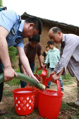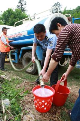 京山遭受持续干旱。目前,该县受旱作物面积已达到51.3万亩,有14个镇140多个村的3.9万人和9000头牲畜发生饮水困难,给全县农业生产和人民群众生活造成了很大影响。当前,该县正组织广大干群全力抗旱,共投入抗旱机械87708台套、劳力19.16万人,镇、村两级已投入抗旱资金1600多万元。图为5月8日,当地派出所驻绿林镇吴集村工作组正在为三组缺水村民送水。(本报视界网翟存波摄)