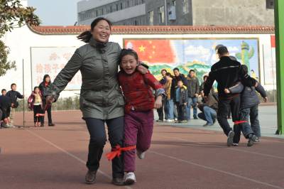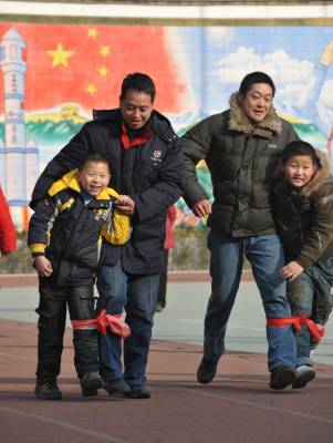 12月29日,襄樊市长虹路小学低年级的学生们与父母一起参加”两人三足”跑步比赛,”两人三足”跑是襄樊市长虹路小学第5届体育节上自创的新项目之一。该校将1000米阳光体育煅练分解成各种趣味性的竞技,增加学生投入体育煅练兴趣,激发学生们全体参与意识。