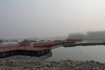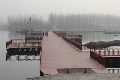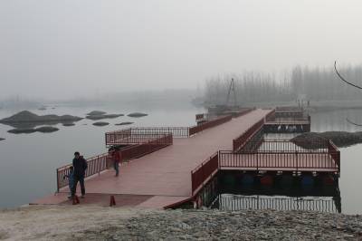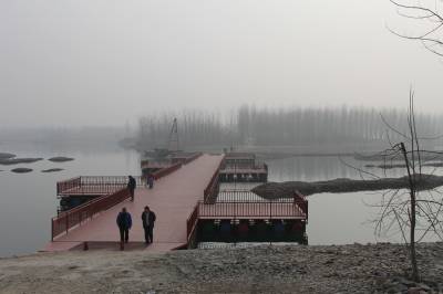 丹江口市右岸羊皮滩是经汉江多年冲刷形成的自然湿地,是该市“一江两岸”滨江景观带的核心区域。去年5月,丹江口市十七届人大常委会通过决议,将羊皮滩及周边湿地列为禁止建设区域,依法实施生态保护,适度开发建设为湿地生态公园。月亮湾与羊皮滩隔河相望,到岸则需绕行3公里多的大圈。为了游客方便,近日,该市“一江两岸”建设指挥用532个油桶搭建起一座长120米、宽6米的浮桥,路面铺上了防滑板,两边安装了护栏,受到游客欢迎。(本报视界网 钱芹 摄)