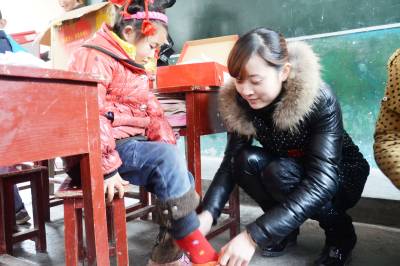 1月15日,三岔乡汾水小学,一名“爱心妈妈”正在给留守儿童穿上新买的旅游鞋。当天,三岔乡妇联组织巾帼志愿者开展“爱心暖童心、童鞋奔明天”关爱活动,该乡巾帼志愿者为汾水小学20名贫困留守儿童送去了20双旅游鞋。 据悉,此次活动关爱对象主要是贫困留守儿童、服刑在教人员子女,由巾帼志愿者一对一结对帮扶一名贫困孩子,为他们捐赠一双价值200元的旅游鞋。 (本报视界网童秀清摄)