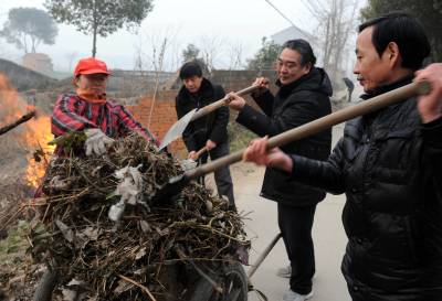 16日,区政协“三万”活动工作组成员正在郢城镇高路村和村民共同清扫垃圾。工作组先后帮助村里修建垃圾池、清理沟渠和赠送垃圾车,改善当地卫生条件。据介绍,荆州市荆州区有97个驻村“三万”工作组,不但帮助村民清扫垃圾,修建卫生设施,同时引导村民养成良好的卫生习惯,改善村容村貌,为新农村建设打下良好的基础。 (记者 杨平 摄)
