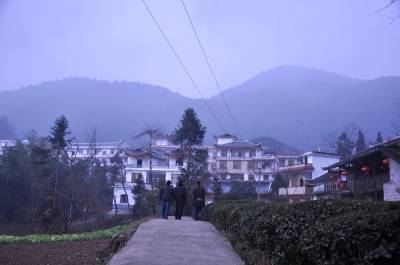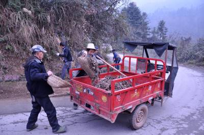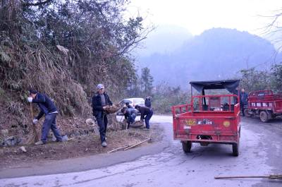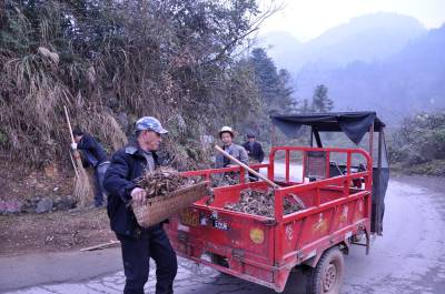 2013年1月17日,宣恩县万寨乡伍家台村民在通往被誉为“中国茶叶第一村”的伍家台乡村公路上清理公路上的垃圾和排水沟里的淤泥。