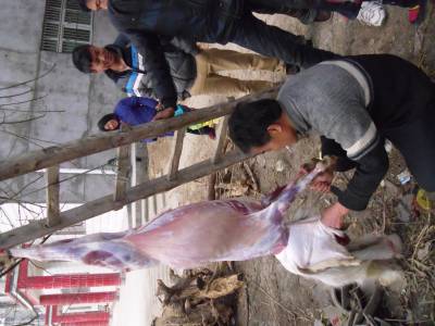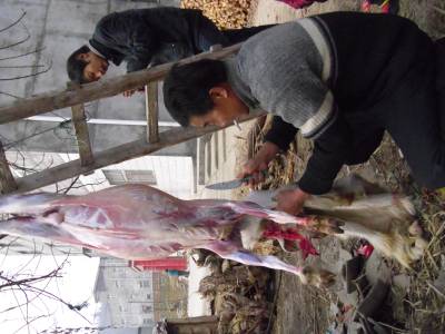 蛇年的年关将至,在鄂西北——郧西县的广大农村,家家户户杀猪宰羊,准备过年的年货,到处一派忙碌的景象。图为河夹镇东寺村一组村民李传东在宰羊。 范正群