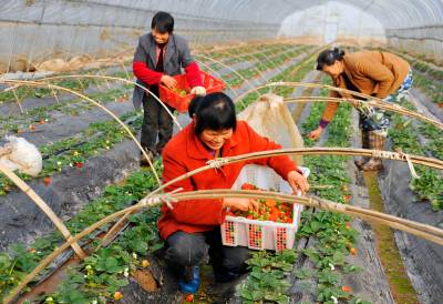 昨日,鄂州市东港村农民正在采摘草莓。东港村通过土地流转将370亩土地集中建成东港农业种植基地,规模化种植草莓、麒麟冰糖西瓜、娃娃菜等高档蔬果。当前是草莓收获季节,该基地聘请当地村民对基地草莓统一采摘,并集中销售,帮助农民增收。 郑博 摄