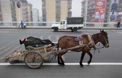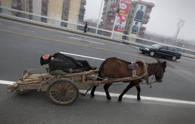 1月19日,一架骡车奔驰在车辆穿行的襄樊长虹大桥上,而躺在骡车上的车主却酣然入睡。记者从樊城桥头一直跟随至襄城檀溪路,一路未见车主醒来。
