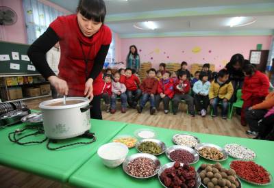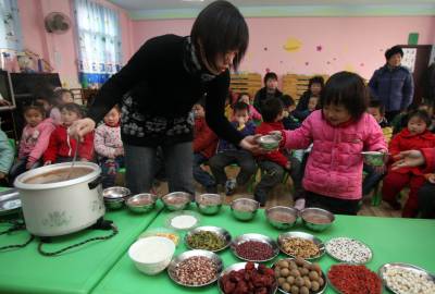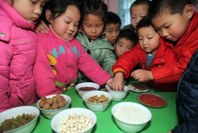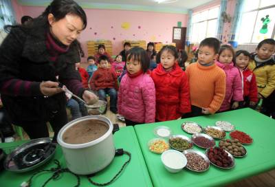 认识腊八节 1月22日是我国传统节日腊八节。1月21日,襄樊市供销幼儿园的老师们请来社区老年人,给孩子们讲腊八节的古老传说和民间过腊八节的习俗,并买来五谷杂粮,教孩子们认识粮食,吃腊八粥,让孩子们了解民族传统文化,体验中国传统节日,激发民族自豪感。