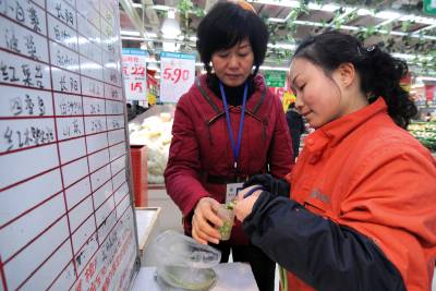 严把蔬菜检测关21日,黄石市农产品质量安全监督检测中心工作人员正在某超市抽查蔬菜质量。为确保农产品消费安全,该中心2009年共抽样检测叶类菜、果菜类、豆菜类24个品种18950个蔬菜样品,其中有1094个蔬菜样品农药残留超标,平均合格率为94.2%。今年伊始,他们每天对超市、蔬菜批发市场的蔬菜进行抽查,严把农药残留超标的蔬菜进入市场,让市民吃上放心菜。黄石市黄石日报摄影部邱孝威摄电话:13807232603邮编:435002