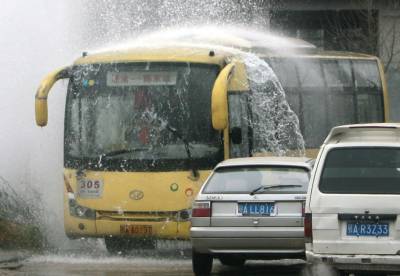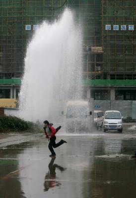 昨日中午,武汉古田三路,路边一消防栓被破坏,冲出的水柱达10米高,造成附近路段滞水。据附近居民介绍,消防栓是被旁边一工地的铲车施工时意外铲断的,现场许多过往车辆排队等待”免费”洗车。记者柯皓摄