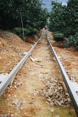 村民用双轨软索运输物品昌市财政局自2006年来,对口帮扶宜昌点军区土城乡黄家岭村,在陡峭的橘山建起多条双轨软索运输线。图为村民正在利用传输轨道运送物品,柑橘收获季节更显科技就是生产力的优势。