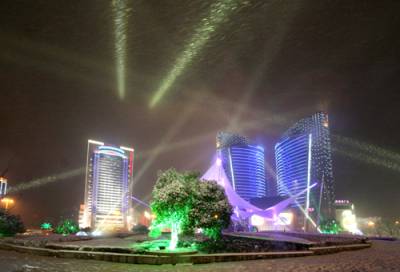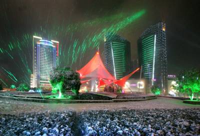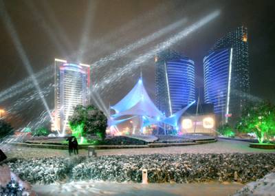 1月5日,降下了2010年第一场雪,武汉光谷广场的雪夜在灯光交辉下,景致特别,光谷的意味十分突出。(组照4幅)