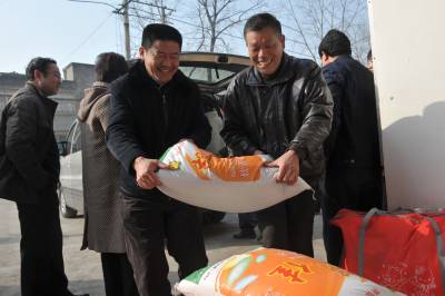 1月25日,谷城县龚家河村贫困户激动地接过企业家送来的过年物资。当天市工商联主席王绍玲、精信催化剂有限责任公司董事长余少发带着45000元现金和粮油物资来到对口联系村,为困难群众送温暖,同时为村民送来用工信息。