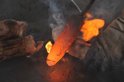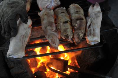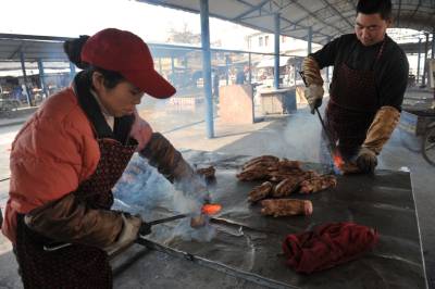 1月25日,记者走进谷城城关农贸市场,老远就能闻到一股猪肉被烙焦后散发出的焦糊气味,烙肉经营户王师傅一家人用火红的烙铁烙猪蹄。只见烙铁在师傅手中娴熟地不停上下翻飞的猪蹄肉上,吱吱地冒着的蓝色的烟,空气中飘散的焦肉香味。已经在这经营了多年的烙肉经营户王师傅介绍,烙铁烙过的猪肉可以去腥味,虽然烙猪头猪蹄肉不是啥技术活儿,但是一件很麻烦的事儿,得凭体力一把新烙铁重达十二斤,烙铁在灶膛烧红后将猪头上耳孔、鼻孔、耳后、猪脸等处的猪毛烙干净,一只猪头毛烙干净,就得换四五把烙铁,一年下来光烙铁就用坏了二十多把。如今,烙铁烧红后去掉猪毛这手艺在大城市已经很少见到,好多回乡的谷城人临走时,总忘不了要带上几只,经他一家人加工的肉制品被带到太原,河南等地,甚至被带到港澳台。