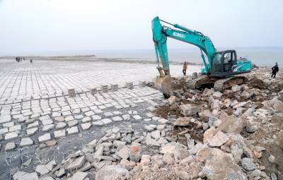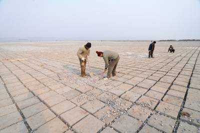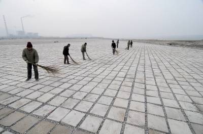 黄石江滩铺满水泥”马赛克”26日,施工人员正在黄石西塞江滩清扫铺在沙滩上的水泥板”马赛克”。这是由宜昌航道管理处负责施工的长江黄石段江滩治理工程,该工程从去年9月开始在西塞至河口20万平方米的江滩面上铺设水泥板”马赛克”,目前已完成15万平方米的治理工程,今年4月将全部完工。通过治理后,此处的江滩沙土流失将得到有效控制。黄石市黄石日报摄影部邱孝威摄电话:13807232603邮编:435002