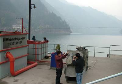 2月1日,两名工作人员正在对藻水分离机进行检修。清江大龙潭库区是恩施州城20余万居民的饮用水源,2008年8月曾出现疑似水华现象,引起国务院、省、州领导的高度重视。2009年,在湖北省财政厅、省环保厅的支持下,大龙潭水电开发公司争取到鄂西生态文化旅游圈重点工业污染综合整治项目,在库区鸭松溪处建成了全省首座藻水分离站,设计除藻能力每年400吨,配备富藻水抽吸船、富藻水驳运船各一艘。库区湖面设置有浮栏,将水藻阻隔引导至一处,利用抽吸船将富藻水抽取分离,藻泥通过驳运船运至分离脱水系统处置,清水排回湖中。该站投入运行以来,大龙潭库区再未出现藻类密度偏高、水体颜色变化等疑似水华现象。通讯员周光兵摄