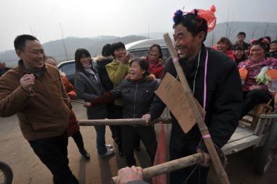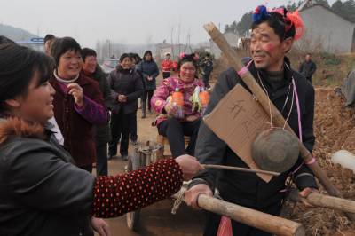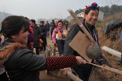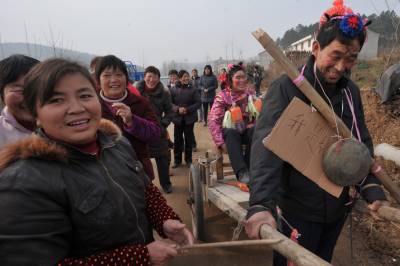 2月1日,襄樊市卧龙镇的一夫妇被邻居们”策划”拉起板车准备为儿子取媳妇。当日是农历腊月18日,结婚车队在湖北襄樊市城乡公路上随处可见。而在近年来,湖北省襄樊民间有很多风俗,儿娶媳妇闹公婆只是其中一种,人丑化一下公公婆婆让新媳妇叫爹叫妈,以活跃气氛,增加喜庆。