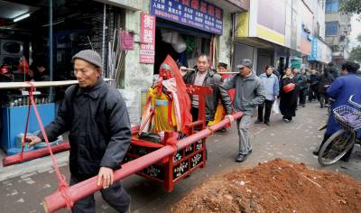 > 抬着”神像”沿街”化缘”