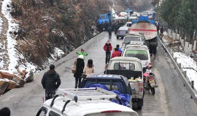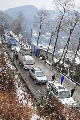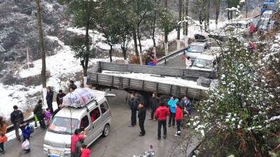 巴东:冰雪天气致209国道上大货车挡住300台车